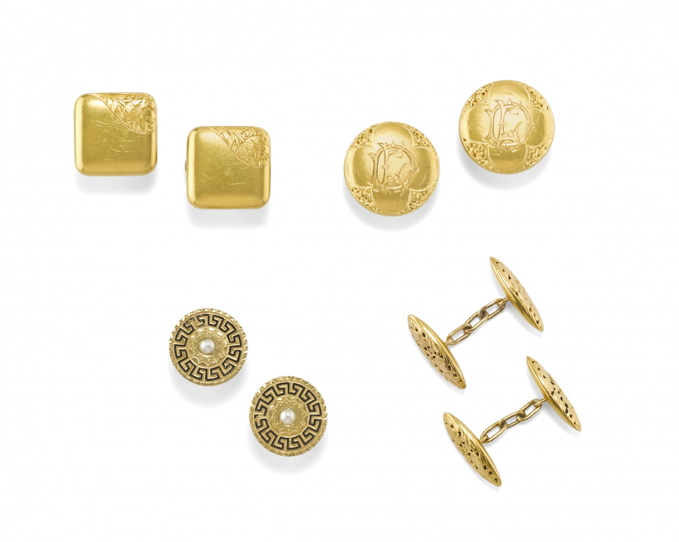 QUATTRO PAIA DI POLSINI E UNA SPILLA IN ORO GIALLO