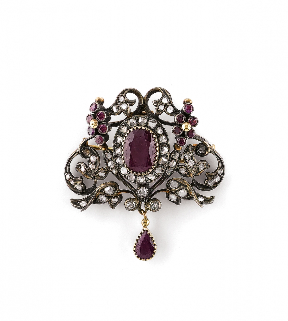 in oro e argento in stile antico con radici di rubini e diamanti taglio rosa.