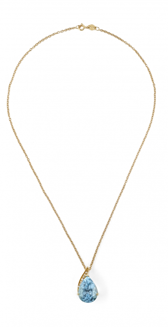 a catena in oro giallo con pendente in topazio azzurro taglio goccia ornato da diamanti.