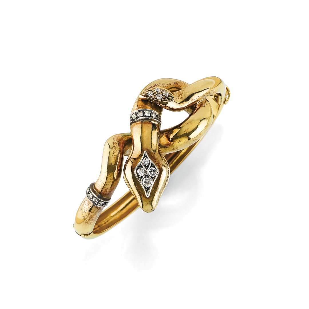 raffigurante un serpente ornato da diamanti di ct 0,40 ca. montati su argento.