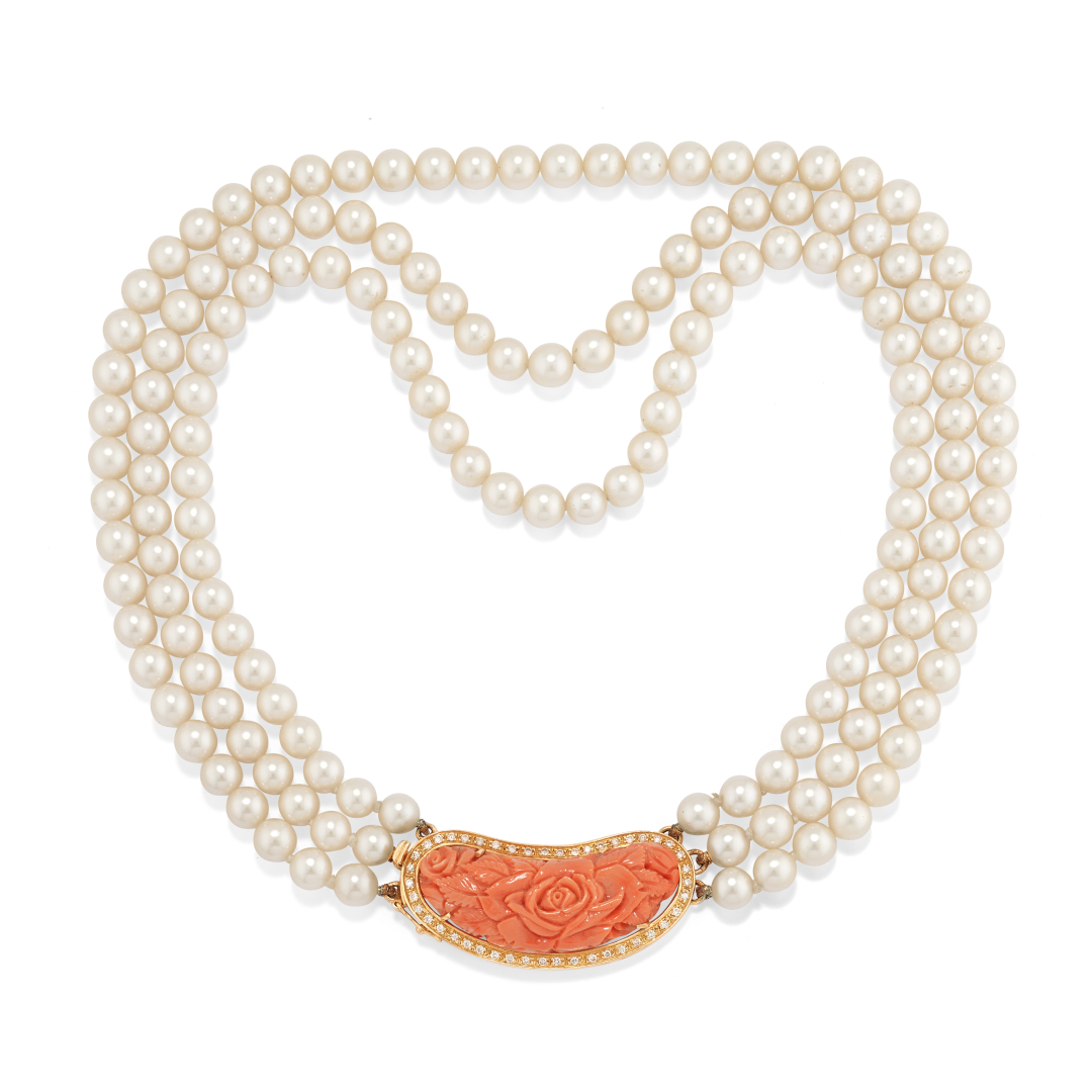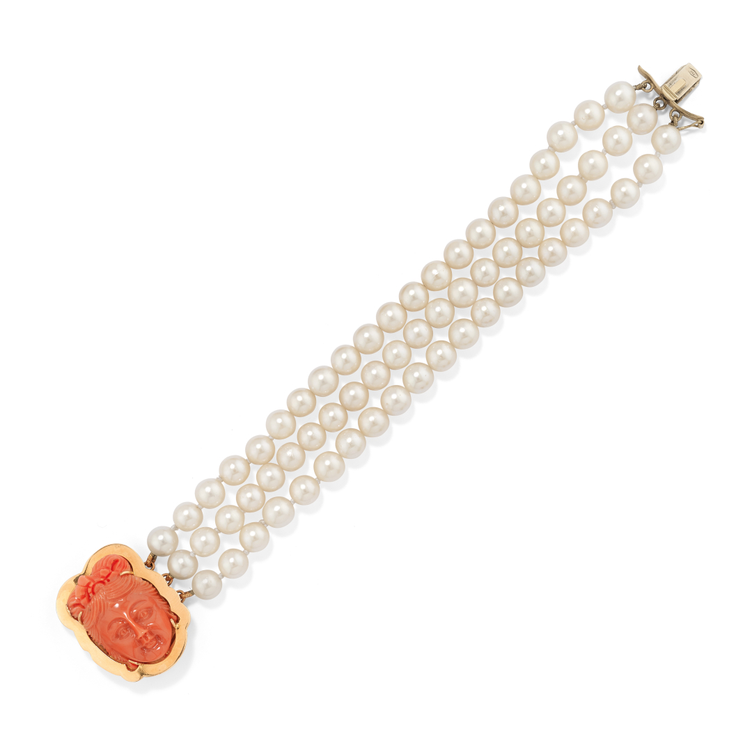 a tre fili di perle coltivate di mm 6/7; la collana è arricchita con chiusura ovaleggiante in corallo, oro giallo e diamanti, il bracciale è arricchito da una chiusura in oro giallo con volto femminile in corallo.