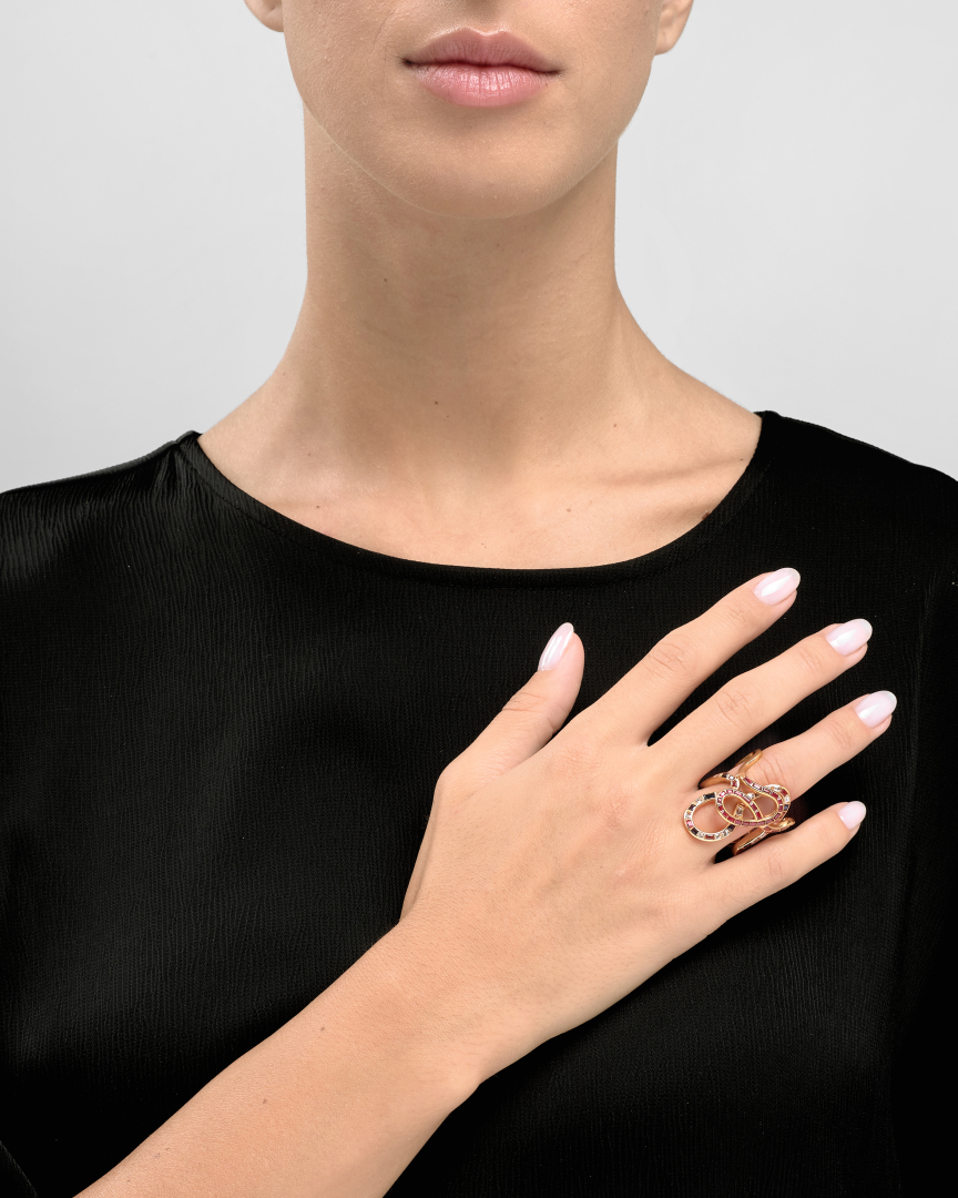 in oro giallo a fasce intrecciate con rubini, zaffiri e diamanti taglio step-cut.