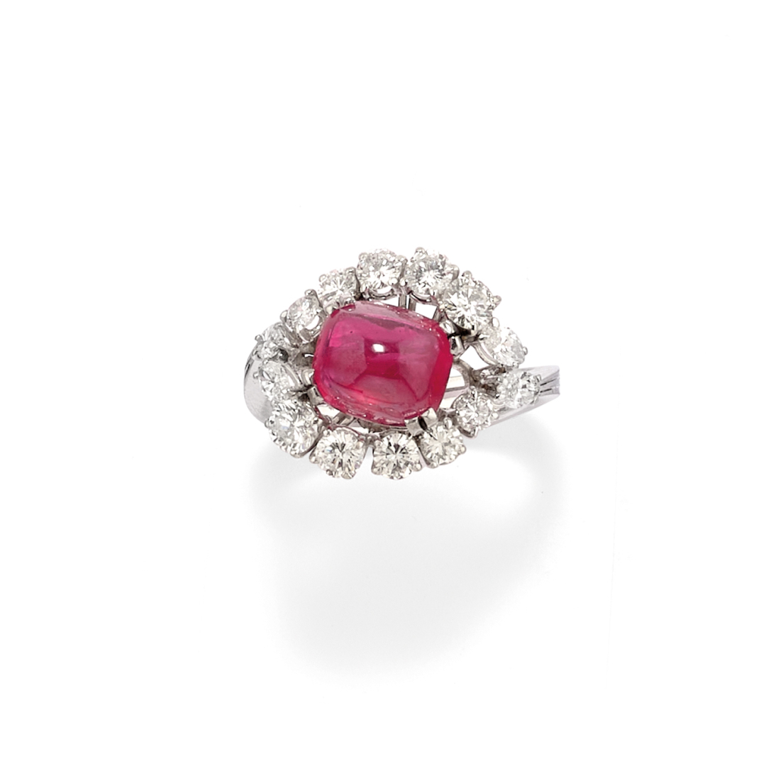 in oro bianco realizzato con gambo a tre fili, diamanti taglio brillante rotondo e taglio marquise per complessivi ct. 1.40 ca. e rubino taglio cabochon di 4 ct. ca.