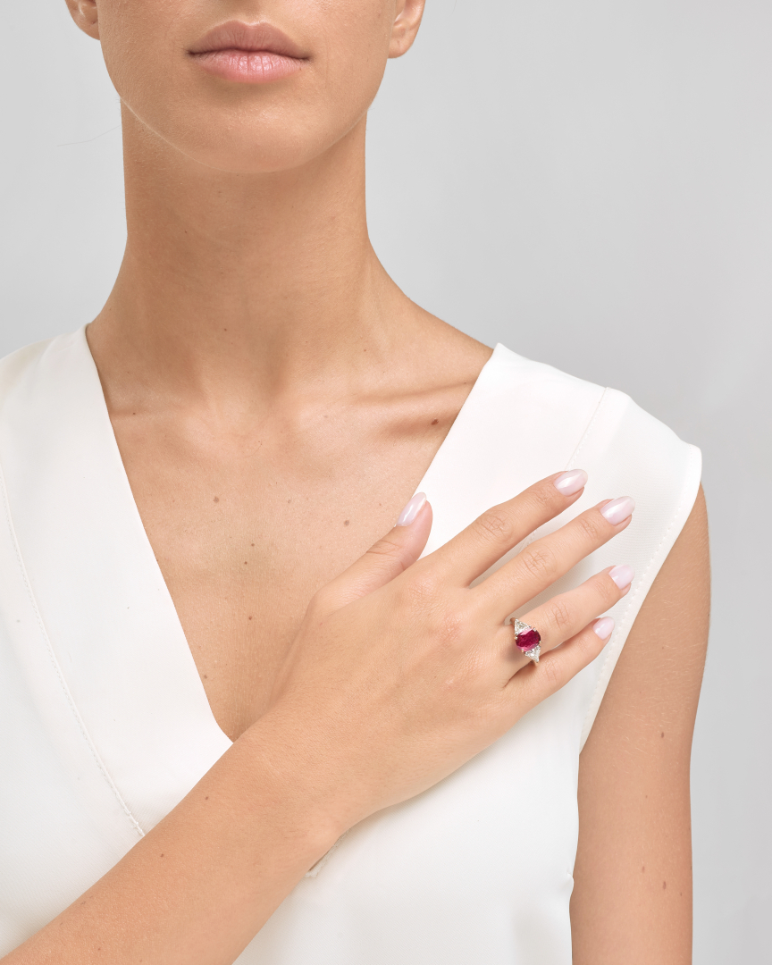 in oro bianco e giallo con rubino ovale di ct. 1,40 ca. e diamanti triangolari laterali sul gambo per complessivi ct. 2,15 ca. 1980.