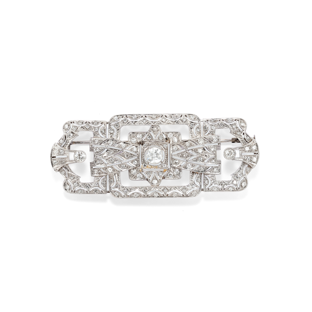 rettangolare in oro bianco, lavorazione traforata millegrain, decorata con diamanti taglio vecchio europeo e taglio rotondo