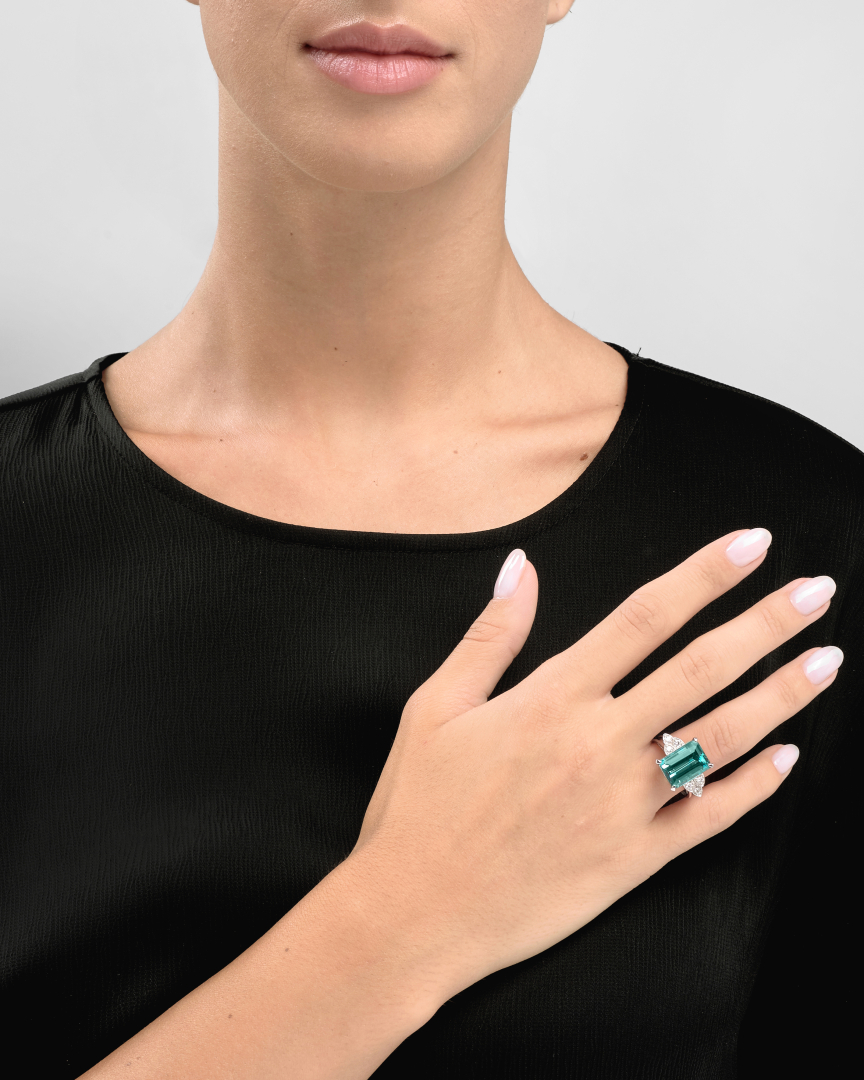 in oro bianco con tormalina di ct 7,00 ca. e diamanti laterali di ct 0,15 ca.
