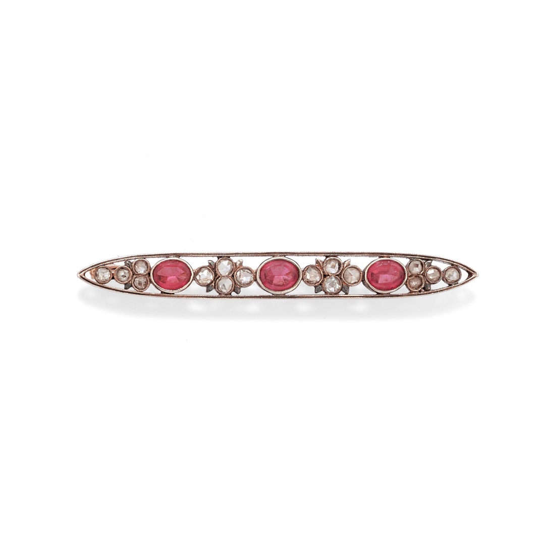 in argento e oro, realizzata a barretta con diamanti taglio rosa e rubini.