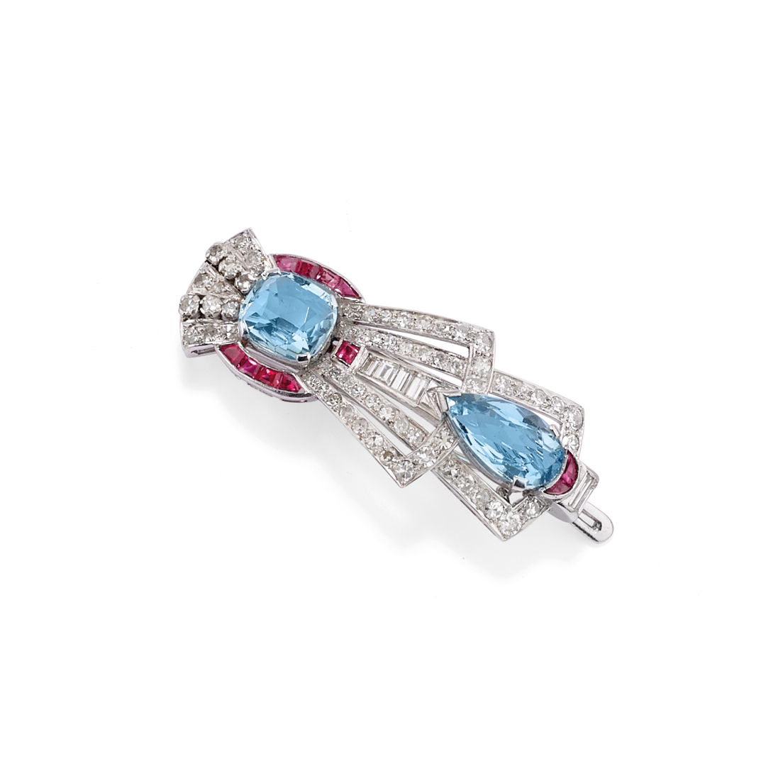in oro bianco, con diamanti tondi taglio huit-huit e taglio baguettes, un' acquamarina taglio cuscino di ct 1,75 ca., ed una taglio goccia di ct 2,50 circa e rubini. Epoca tardo decò. 1940.