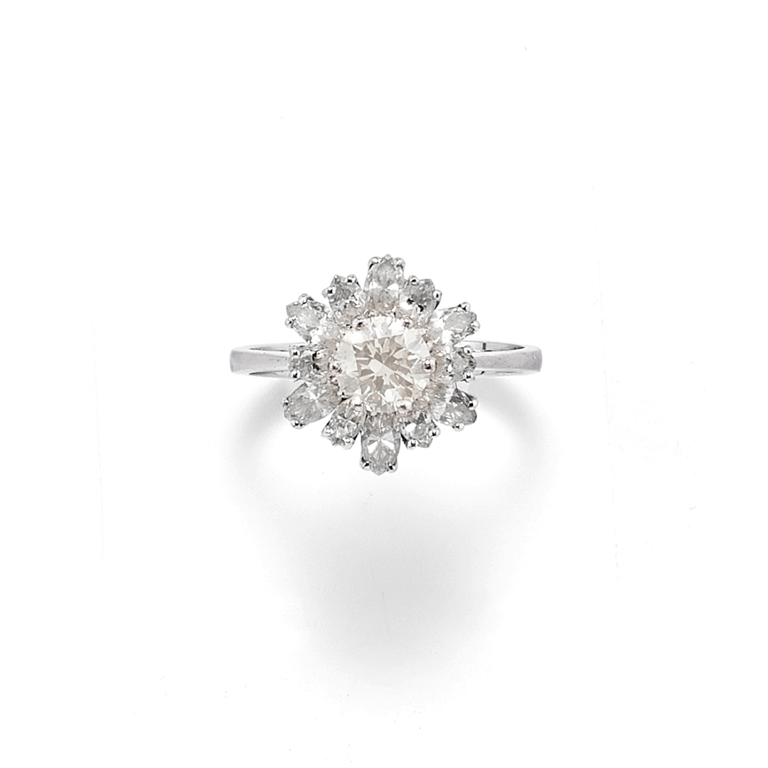 con diamante taglio rotondo moderno brillante di ct 0,70 e petali con diamanti taglio marquise per complessivi ct 0,90 ca.