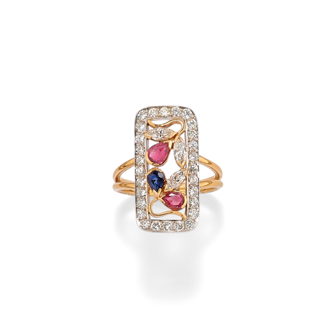 in oro bicolore con cornice rettangolare in diamanti che racchiude due fiorellini stilizzati in rubini, zaffiro e diamanti taglio navette.