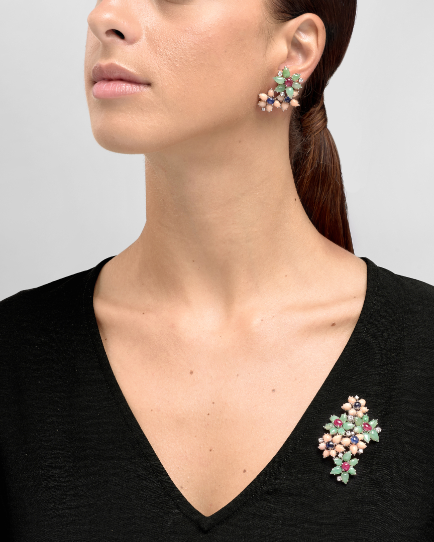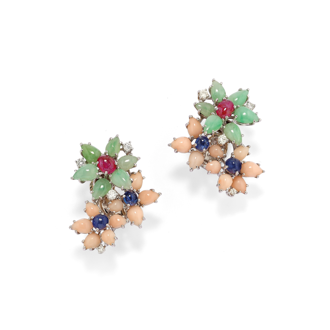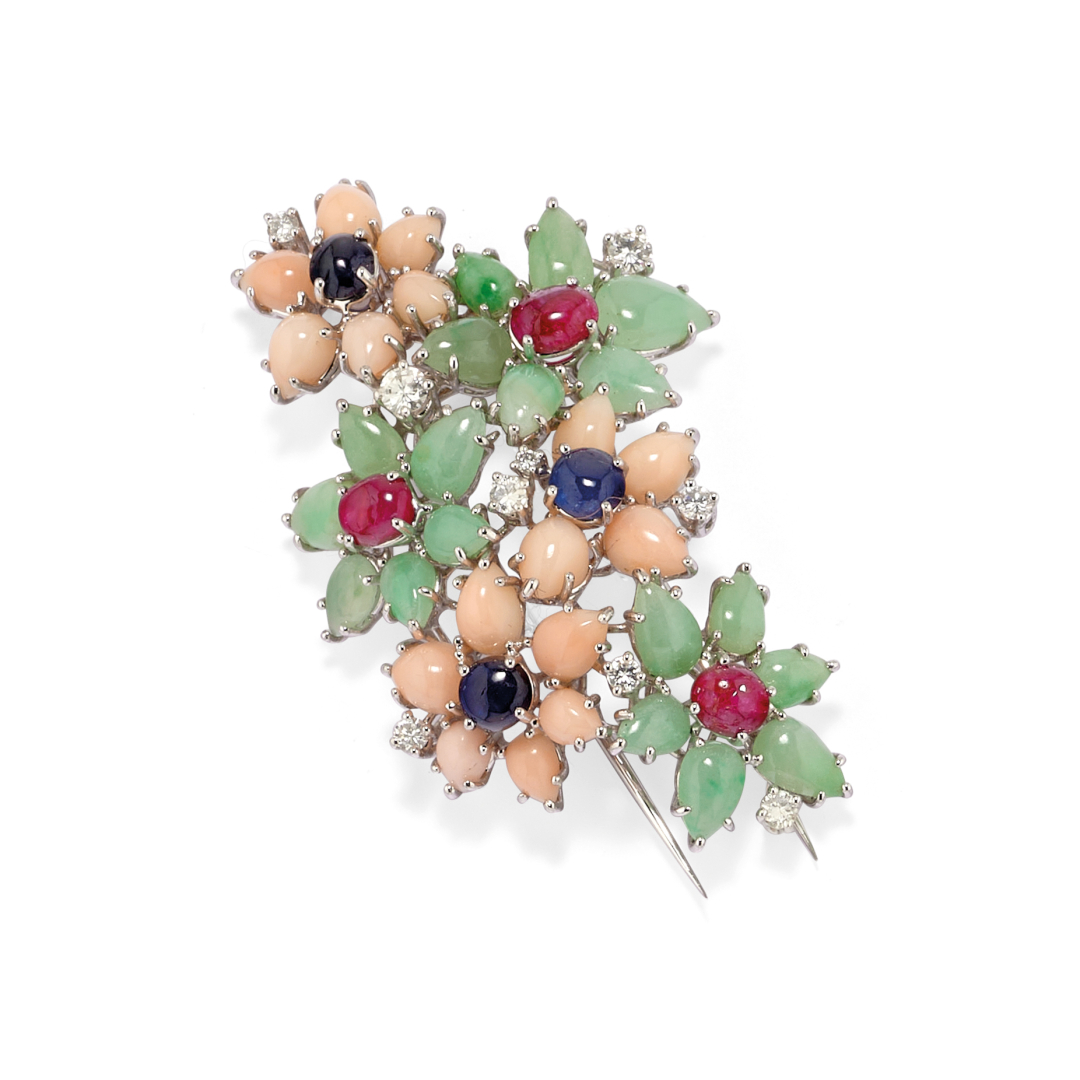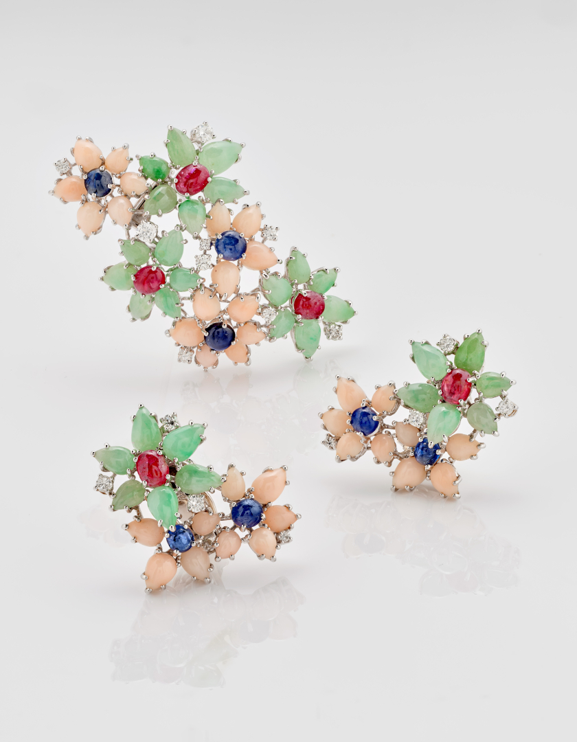 in platino, formata da una spilla e da un paio di orecchini a motivo floreale, con corindoni e gemme colorate cabochon e diamanti taglio brillante.