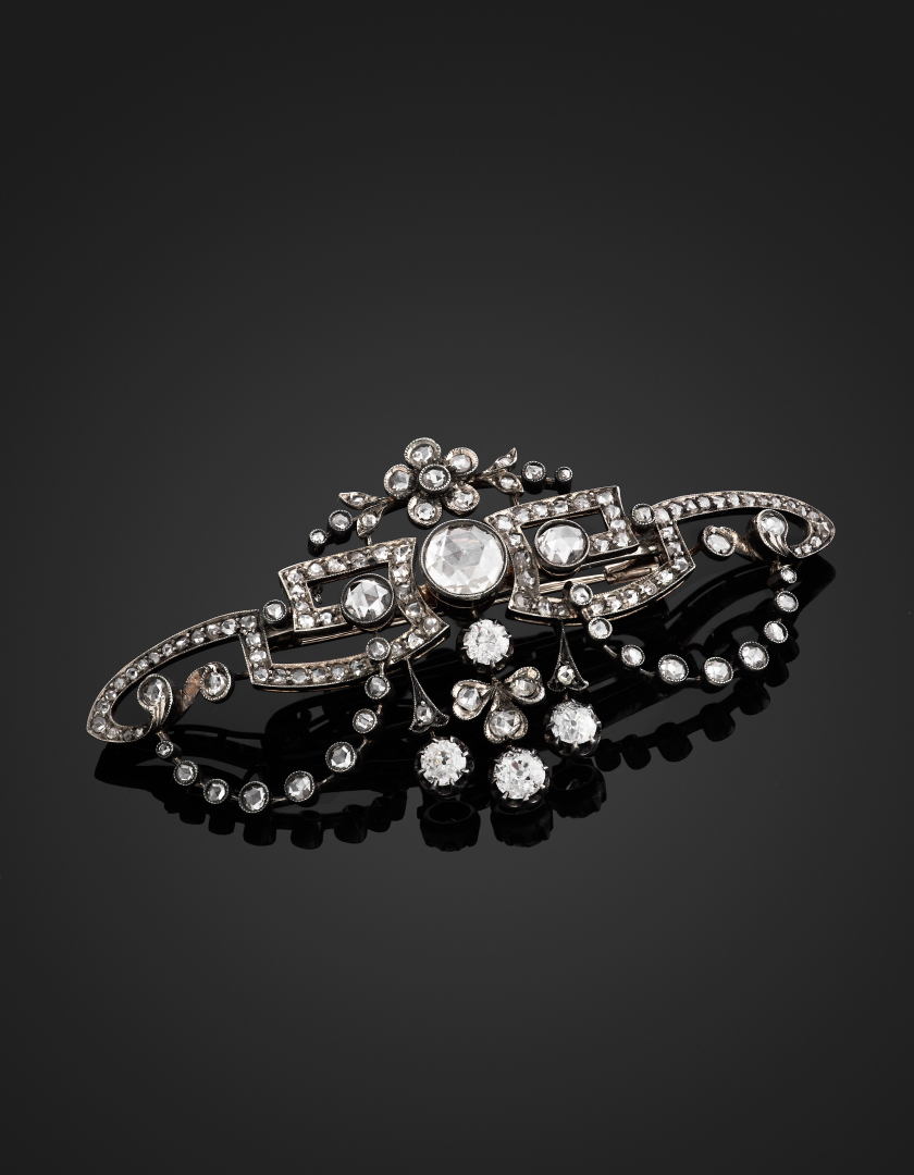 in argento e oro con motivo a ghirlanda, diamanti taglio brillante rotondo Vecchia Miniera e taglio rosa, per complessivi ct. 5,00 ca. Fine XIX secolo.