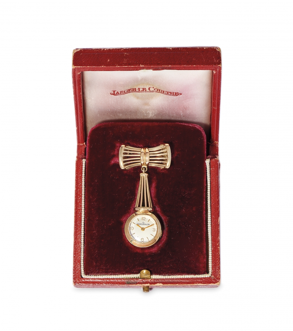 OROLOGIO A FORMA DI SPILLA IN ORO, FIRMATO JAEGER-LECOULTRE, ANNI '60