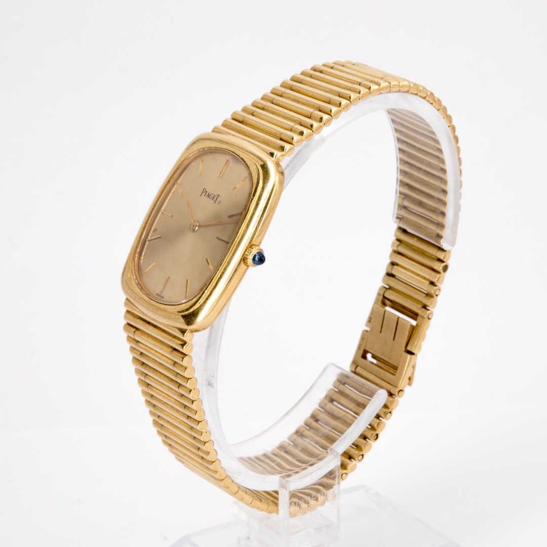 Quadrante dorato, firmato “Piaget", indici a bastone applicati. Lancette a bastone dorate.