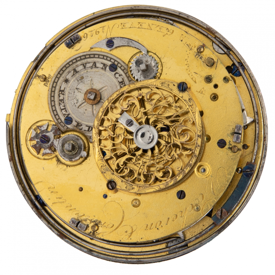 Meccanica con carica a conoide, firmata “Vacheron & Constantin N. 19162”, scappamento a verga, coq traforata, croce di malta per il bariletto. Ripetizione a quarti su due timbri premendo il collarino.