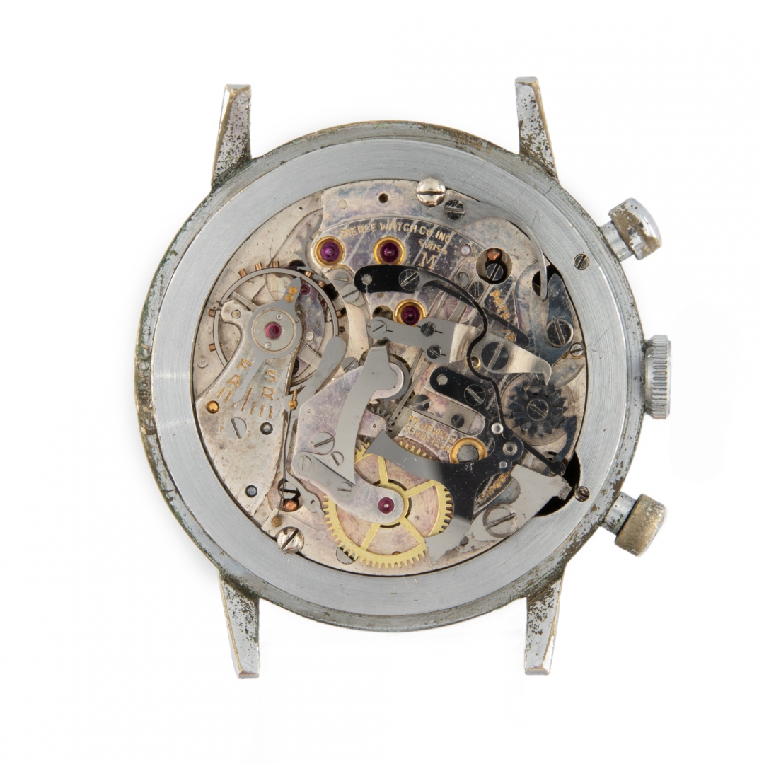 Movimento a carica manuale nichelato e firmato "Pierce Watch & INC”, calibro 134, 17 rubini, sistema di innesto a ruota a colonne e brevetto del sistema di cronografia con frizione assiale, scappamento ad ancora, bilanciere monometallico, spirale piana.