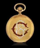 Cassa bassine a quattro corpi in oro 18K liscio, n. 203915, coperchio inciso e smaltato con monogramma “CG", cuvette firmata "Vacheron & Constantin CHRONOMETRE BULLETIN DE 1.ERE CLASSE DE L’OBSERVATOIRE DE GENEVE”. Collarino a barchetta e pendente ad arco.