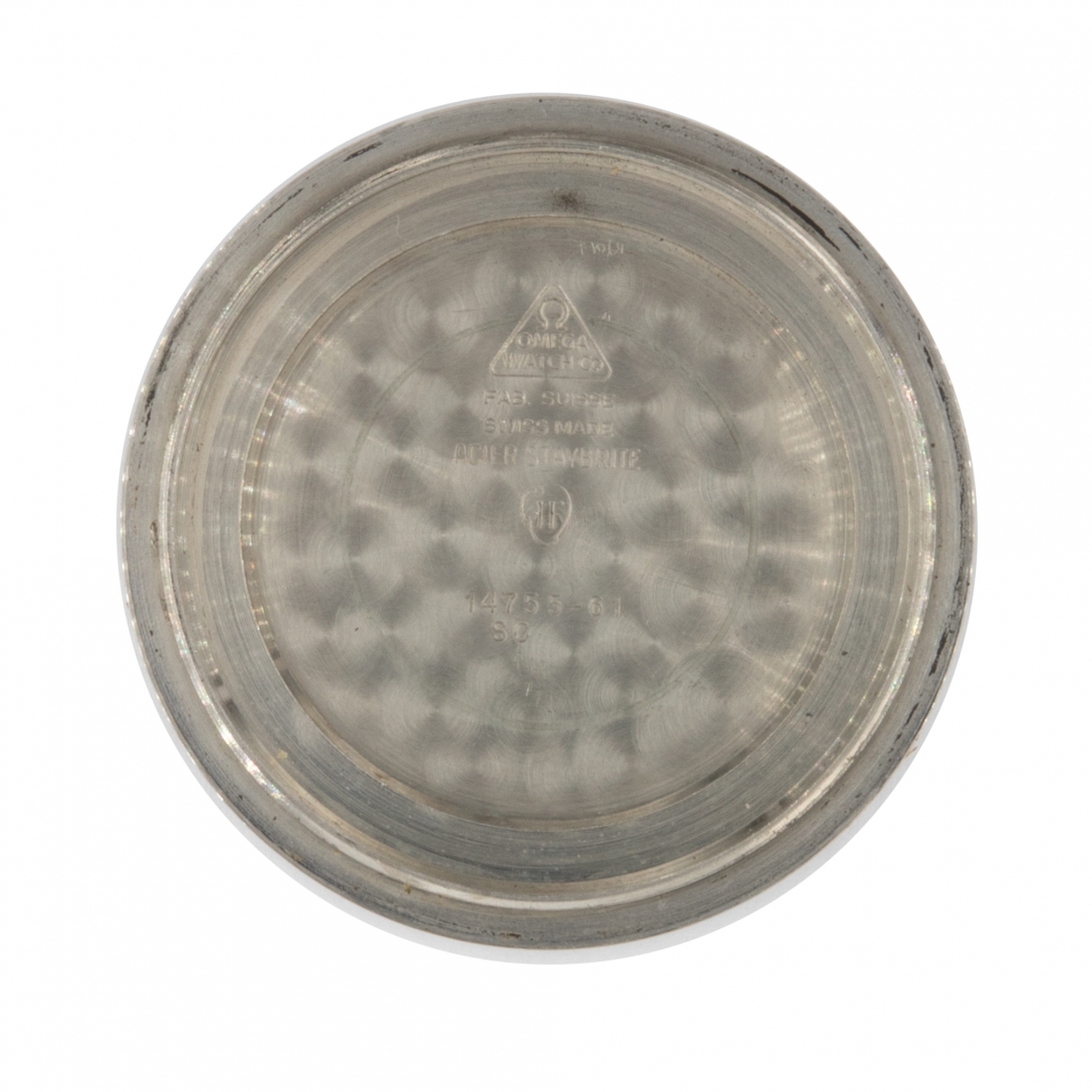 Cassa tonneau a tre corpi in acciaio, anse concave, ghiera girevole con inserto mancante, corona Omega, fondello a vite con inciso il logo Seamaster, punzonato all'interno HF (Huguenin Frères). Cinturino in pelle e fibbia non originali.