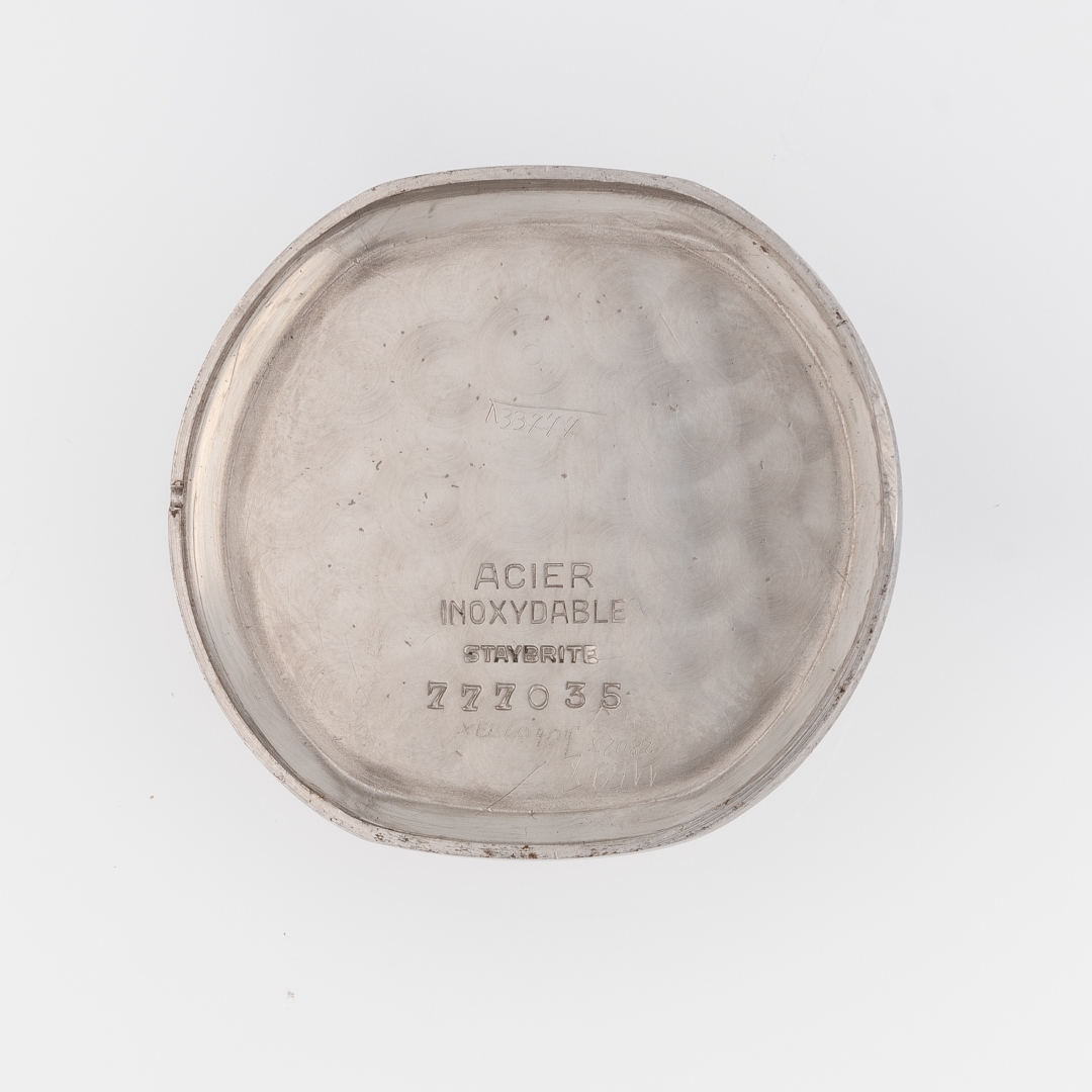Cassa tonneau a tre corpi in acciaio staybrite, n. 777035, lunetta inclinata, anse concave, fondello a scatto, pulsanti rettangolari. Cinturino e fibbia non originali.