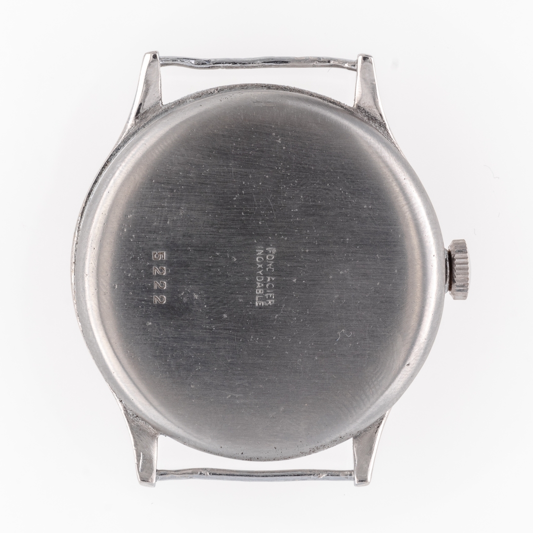 Cassa circolare a tre corpi in metallo cromato, n. 2021548, lunetta piana, anse concave, barrette fisse, fondello a scatto in acciaio numerato 5222.  Cinturino e fibbia non originali.