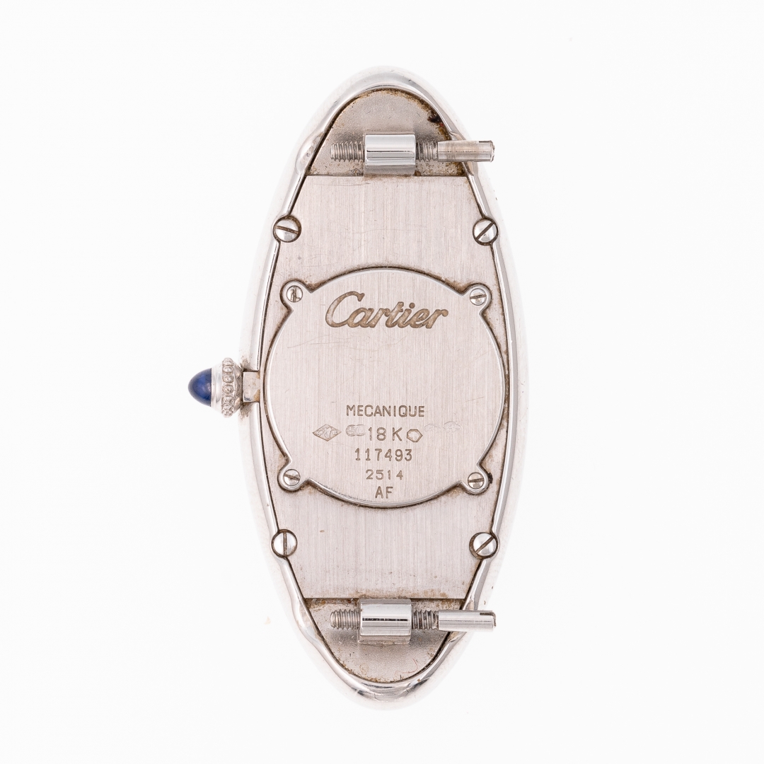 Cassa tonneau allongée a due corpi in oro bianco 18K, firmata, n. 13128 117493, anse nascoste e ansette a vite, carrure bombata, fondello e retro con viti, corona con cabochon. Cinturino e fibbia non originali; accompagnato da déployant Cartier in oro bianco 18K.
