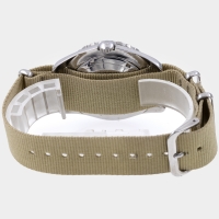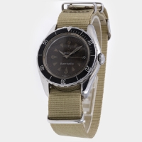 Quadrante nero virato al marrone, firmato, indici a daga e triangolari luminescenti, indicazione della data. Lancette luminescenti a bastone delle ore e a losanga dei minuti, secondi centrali a freccia