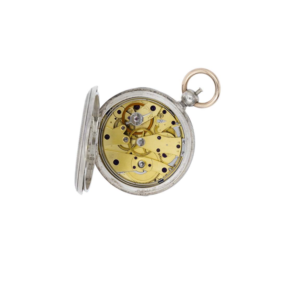 Cassa a quattro corpi in argento, fondello decorato a soleil, cuvette incisa e firmata "Grenard". Quadrante in smalto bianco, numerazione romana.