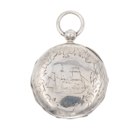 Cassa a quattro corpi in argento, n. 16396, cuvette firmata "Joseph French, Liverpool", carrure poligonale, fondello inciso con veliero e coperchio con cavaliere asiatico.