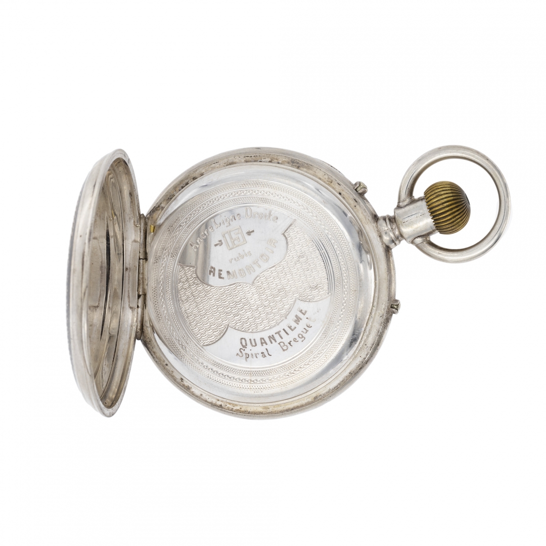 Cassa a quattro corpi in argento, fondello niellato con decorazioni e panoplia centrale, cuvette incisa. Quadrante in smalto bianco, numerazione romana per le ore, indicazione della data, quadrantino ribassato dei secondi.