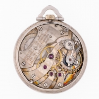 Quadrante argentée, firmato, indici applicati a numeri arabi dei quarti cesellati e con diamanti incastonati, indici a bastone con diamanti a taglio baguette, suddivisione dei minuti con applicazioni circolari, quadrantino ribassato dei secondi con indicazione a settore, lancette a cattedrale.