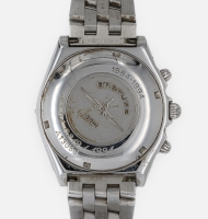 Cassa tonneau a tre corpi in acciaio, firmata, n. 94/0219, ghiera graduata con inserti, anse concave, fondello a vite marcato 1984-1994 e emblema a rilievo di un aeroplano, pulsanti e corona scanalati. Bracciale Breitling in acciaio, chiusura a déployant.
