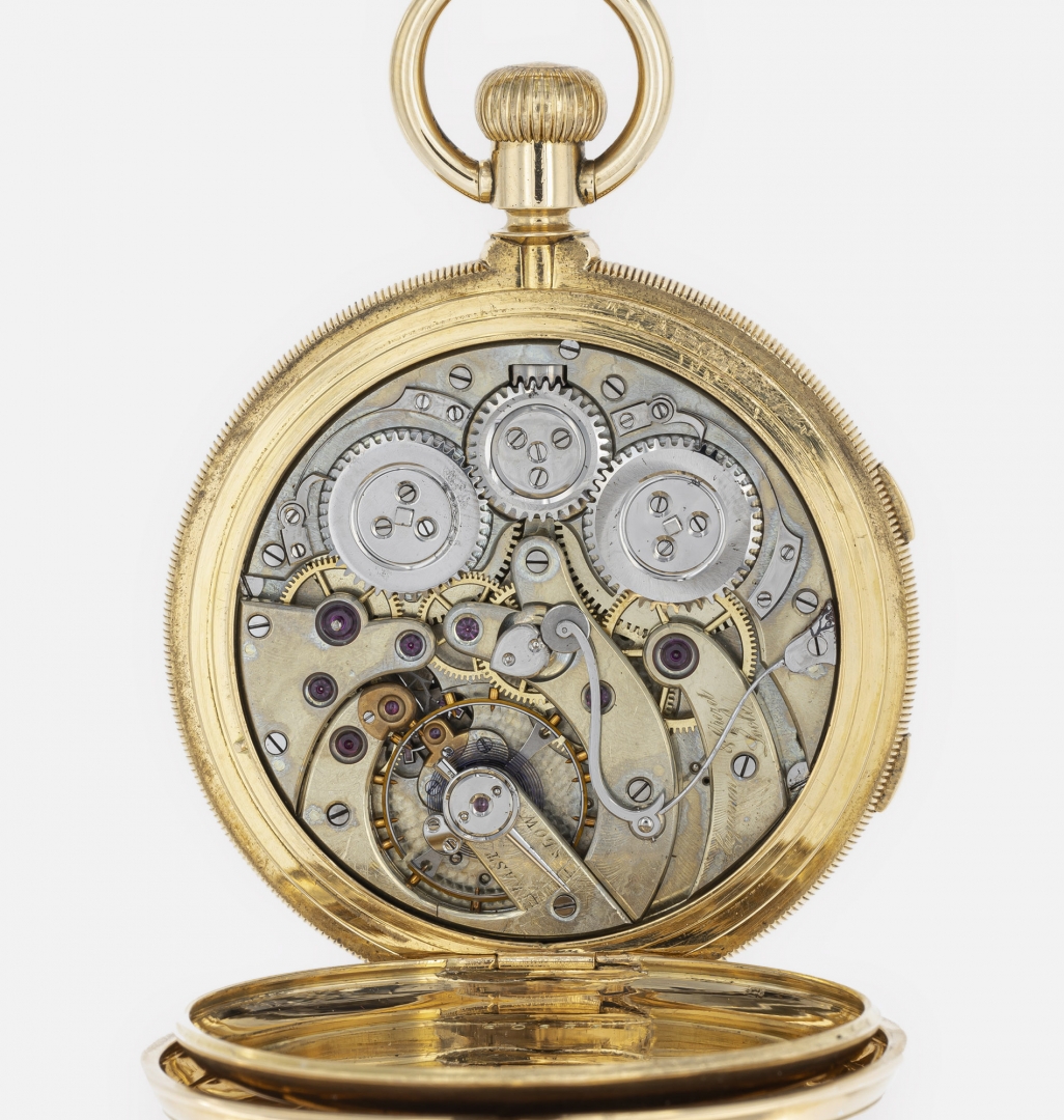 HUGUENIN & GREZET IN ORO ROSA A DOPPIO TRENO, CRONOGRAFO RATTRAPANTE E DIABLOTINE, 1880 CIRCA