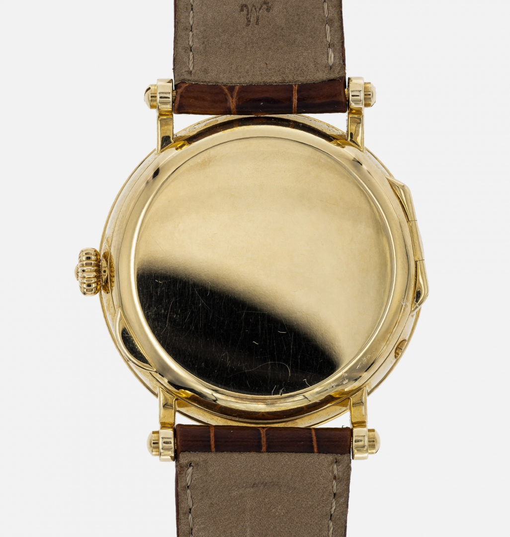 Cassa circolare a tre corpi in oro 18K, firmata, n. 4086087, lunetta bombata, anse dritte, fondello a cerniera. Cinturino in pelle e fibbia in oro Patek Philippe.