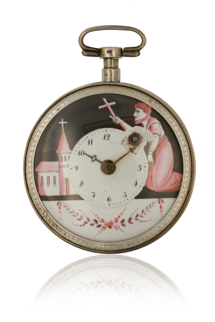 Quadrante: in smalto bianco dipinto con scena allegorica religiosa, indici a numeri arabi.