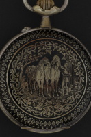 Cassa: quattro corpi, in metallo cromato e niellato, fondello decorato con scena equestre.