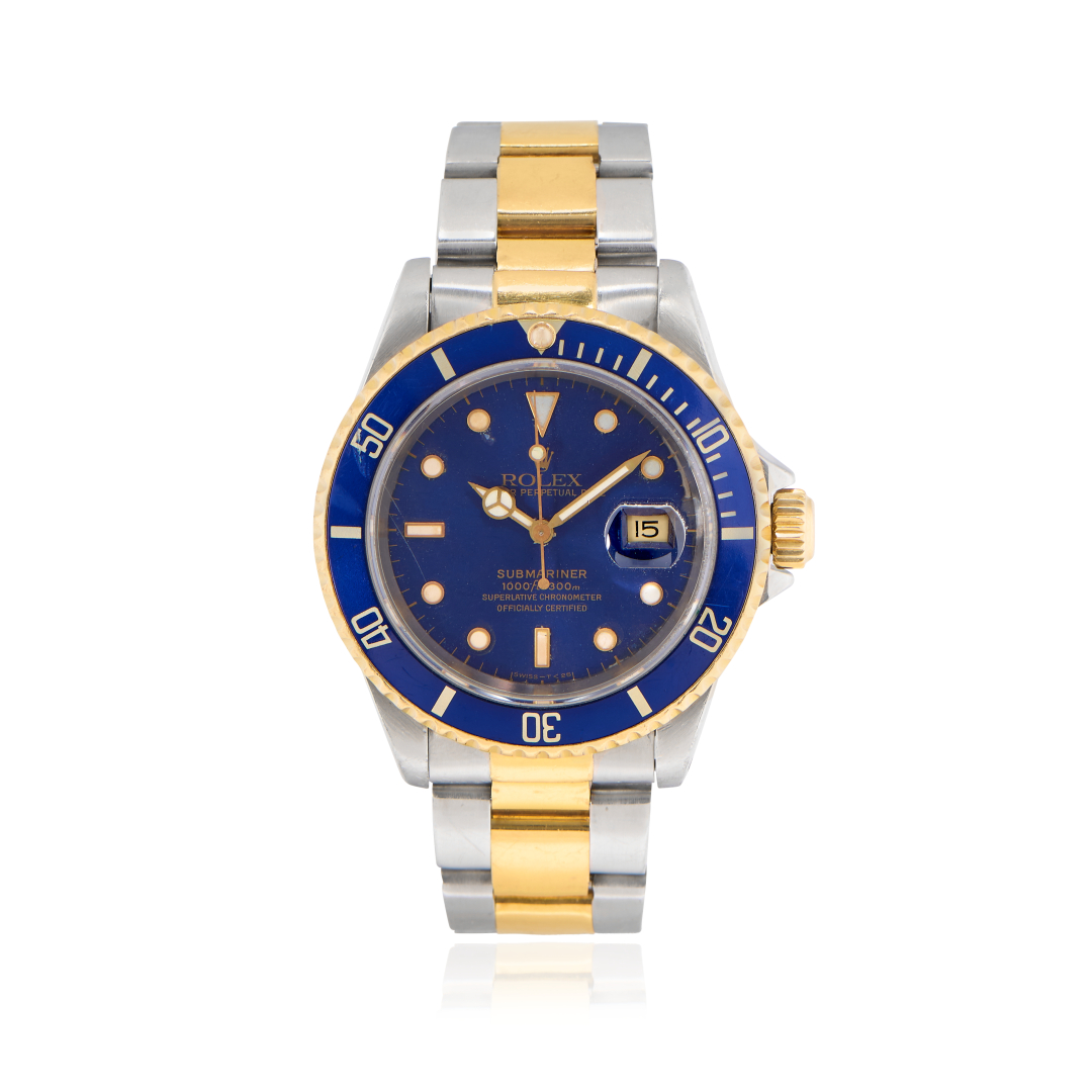 Cassa: firmata, n. W364492, in acciaio, fondello ref. 16610, ghiera in oro con inserto blu graduato.