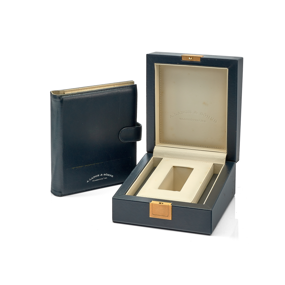 Scatola in pelle nera con difetti, mancante porta orologio, accompagnato da libretto, per modello Lange 1.