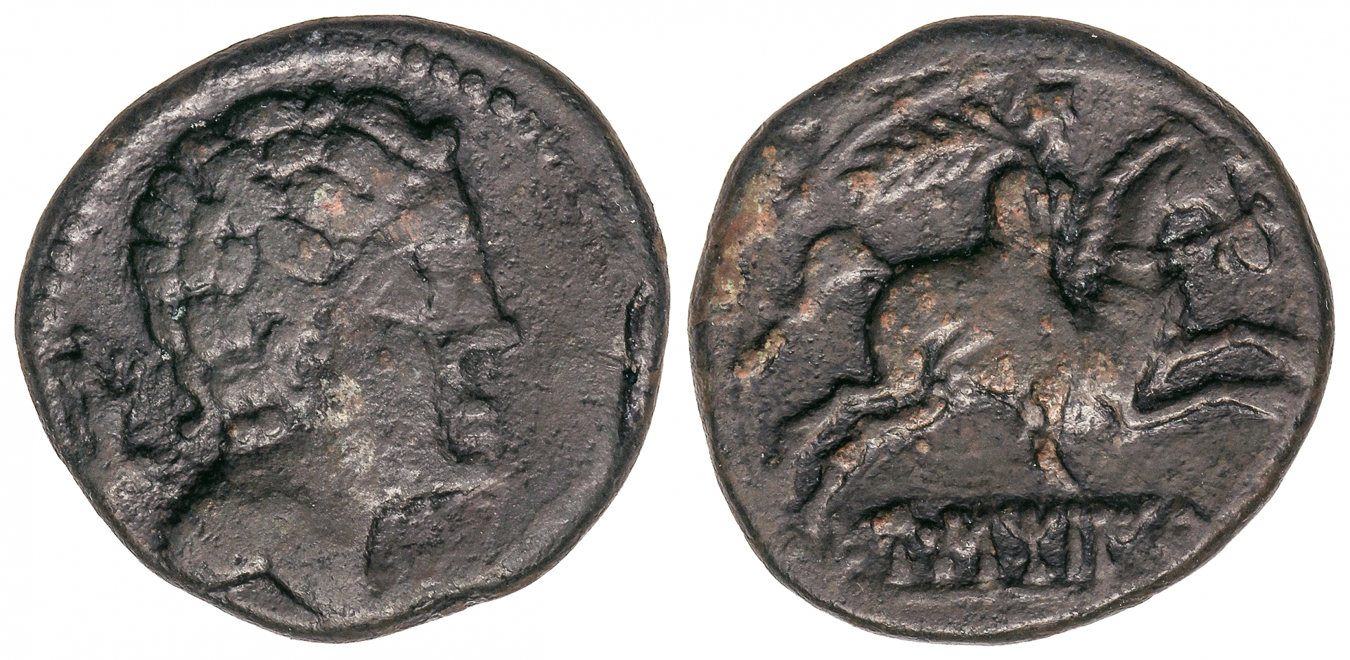 As. 120-20 a.C. EUSTIBAICULA (Zona de CATALUNYA). Anv.: Cabeza masculina a derecha, detrás jabalí. Rev.: Jinete con palma a derecha, debajo leyenda ibérica. 11,08 grs. AE. (Leves oxidaciones). AB-1297; ACIP-1307. MBC/MBC+.