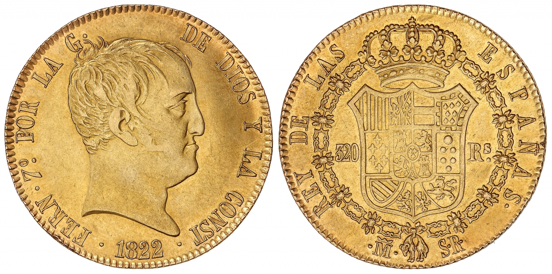 320 Reales. 1822. MADRID. S.R. 27,11 grs. Acuñación algo floja, normal en estas piezas. Restos de brillo original. RARA. Cal-36; XC-1243. EBC.