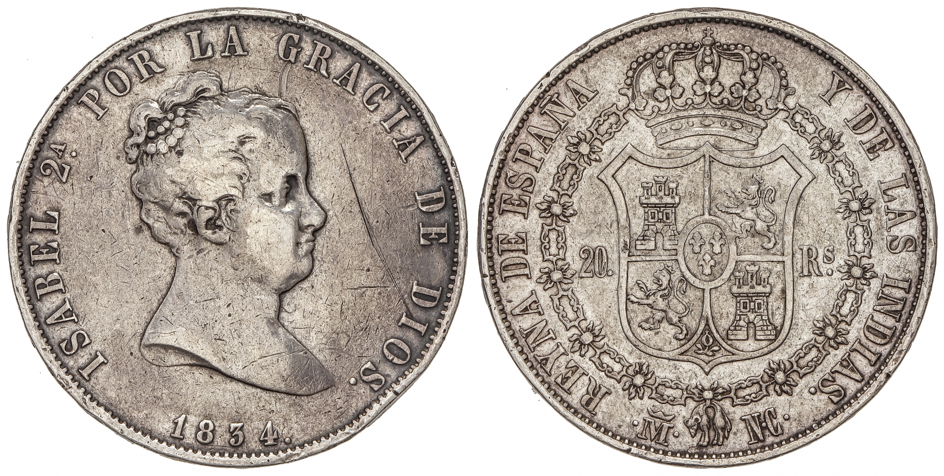 20 Reales. 1834. MADRID. N.C. 26,88 grs. (Pequeños golpecitos). Pátina oscura. MUY ESCASA. Cal-159. MBC-/MBC.