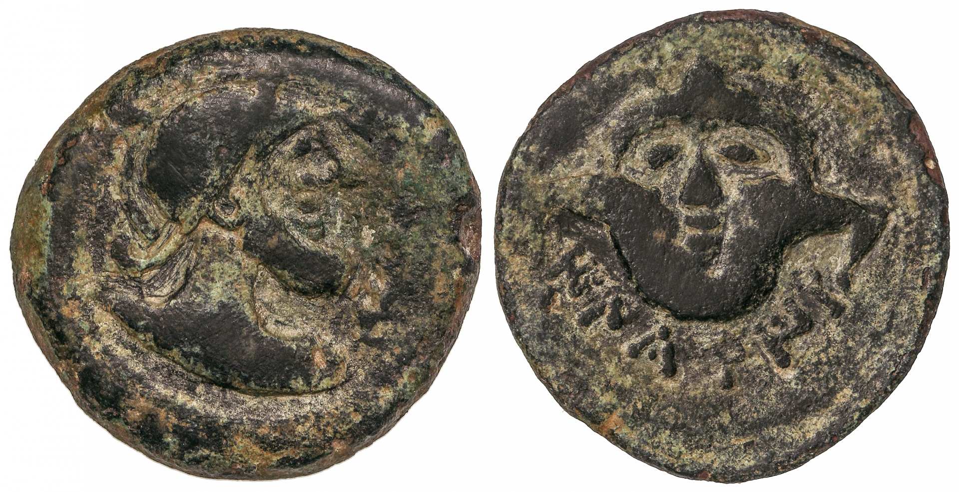 As. 150-20 a.C. ILIBERRI (GRANADA). Anv.: Cabeza masculina con casco a derecha, delante palma. Rev.: Triscela, debajo leyenda ibérica. 19,10 grs. AE. Pátina osucra. ESCASA. AB-1506. MBC+.