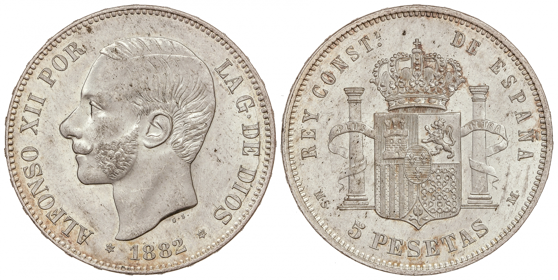 5 Pesetas. 1882 (*18-82). M.S-M. (Levísimos golpecitos). Pleno brillo original. Bonita pieza. RARA ASÍ. SC-/SC.