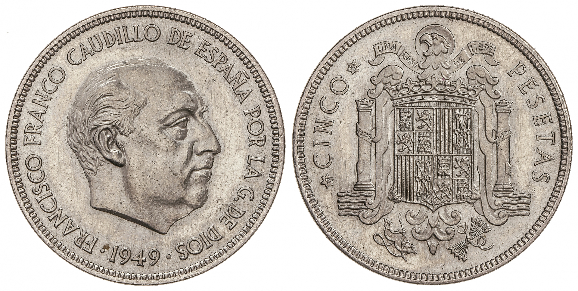 5 Pesetas. 1949 (*19-51). Debido al incremento del precio de coste del níquel en 1951, el valor del metal que contenían estas piezas superaba las 5 Pesetas. Esto produjo su retirada del mercado. Todas las monedas depositadas en la Casa de la Moneda fueron fundidas a excepción de unas pocas, como la que nos ocupa. MUY RARA. SC.