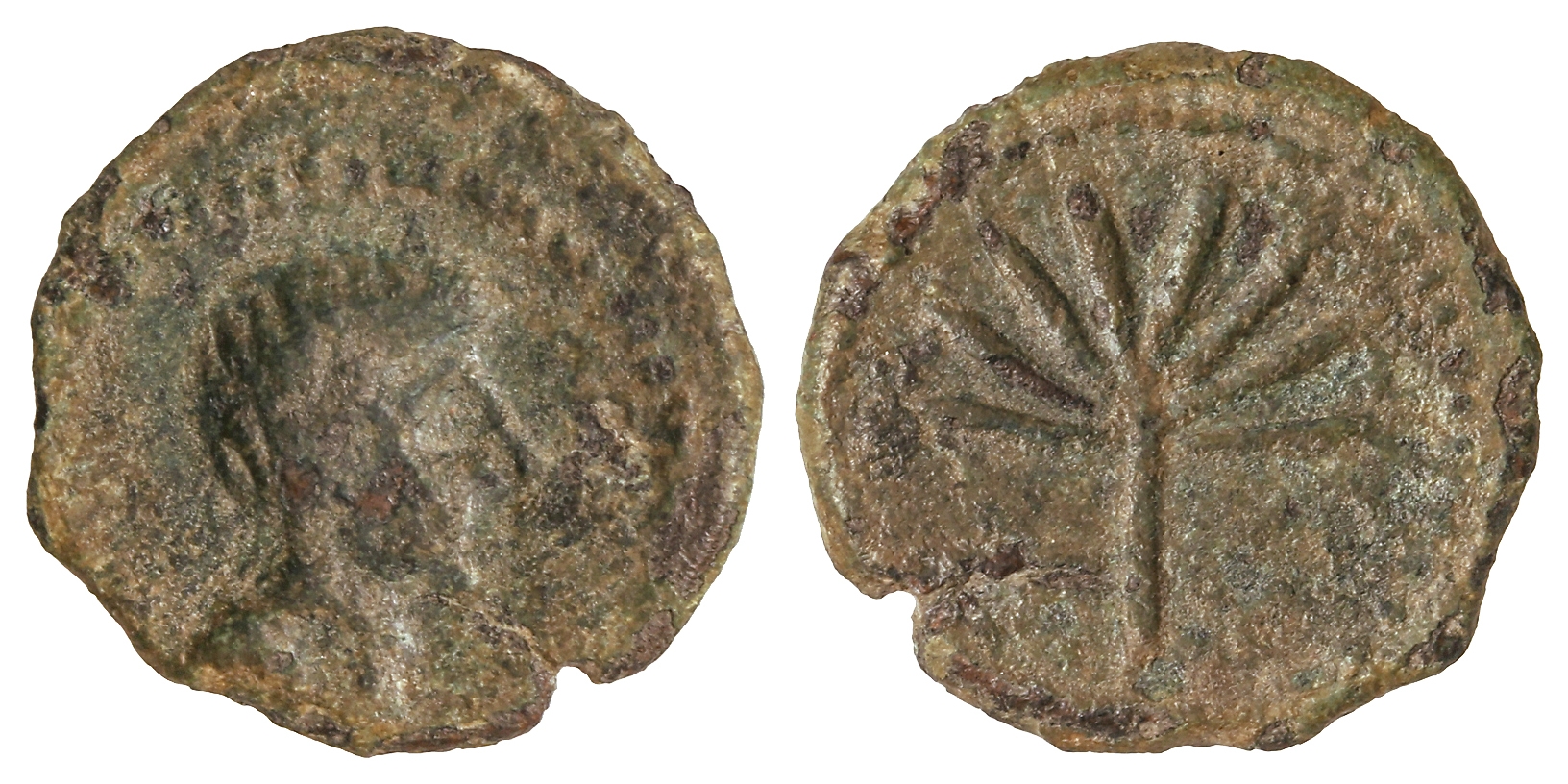 Cuadrante. 50-20 a.C. LAELIA (OLIVARES, Sevilla). Anv.: Cabeza masculina a derecha. Rev.: Palma de hojas abiertas. 2,05 grs. AE. Pátina verde. AB-1654; Vill-4. MBC+.
