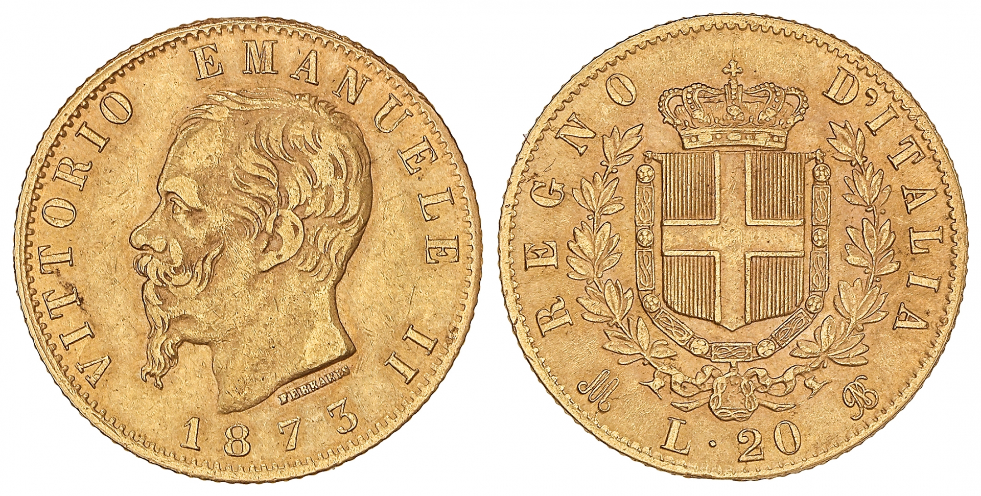 20 Liras. 1873-M BN. VÍCTOR MANUEL II. MILÁN. 6,44 grs. AU. Fr-13; KM-10.3. MBC.