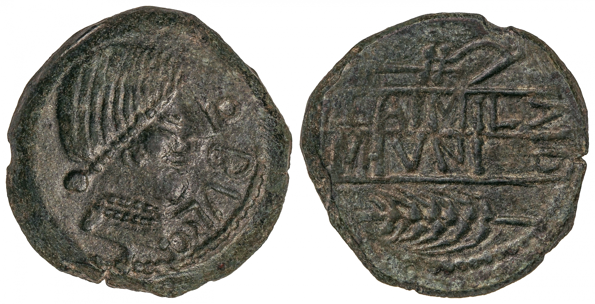 As. 220-20 a.C. OBULCO (PORCUNA, Jaén). Anv.: Cabeza femenina a derecha, delante OBVLCO. Rev.: Arriba arado, debajo espiga, en medio L. AIMIL/M. IVNI/AID. 17,40 grs. AE. Pátina verde. AB-1807. EBC-.
