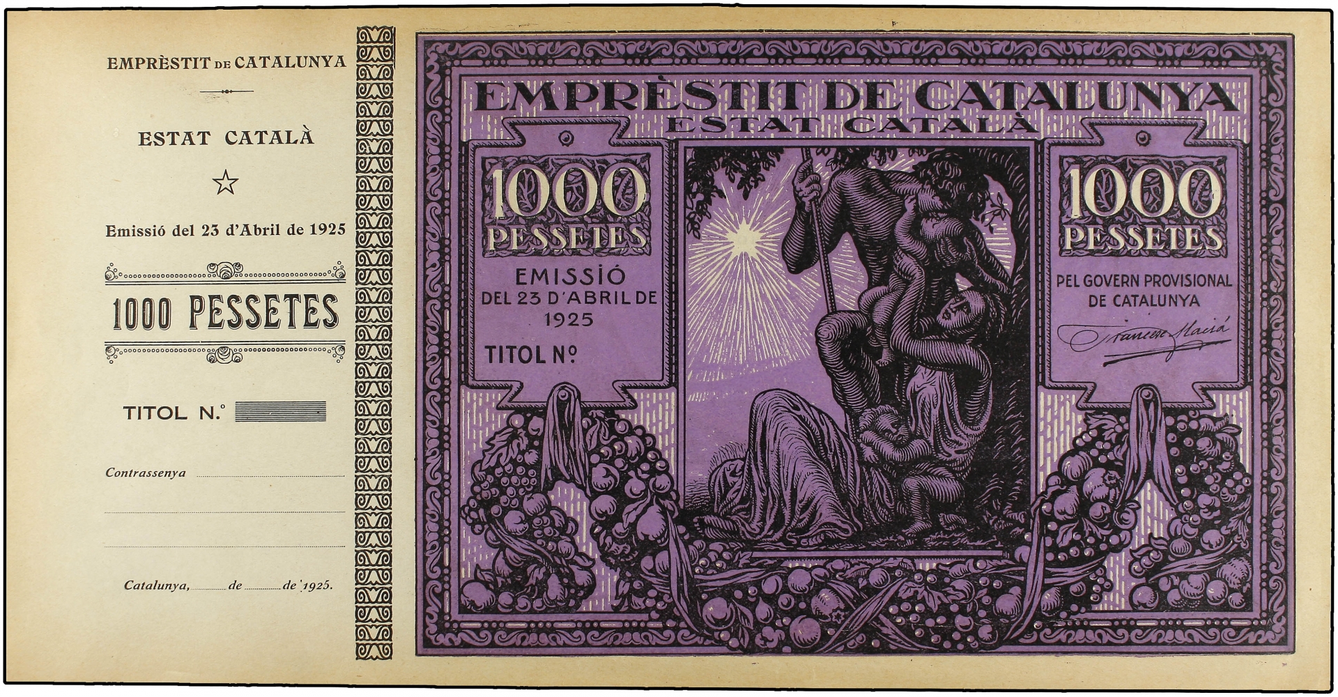Serie 4 Emprèstits 25, 100, 500 y 1.000 Pessetes. 23 Abril 1925. EMPRÈSTIT DE CATALUNYA. ESTATA CATALÀ. Emprèstits Pau Claris. Diseñados por Miquel Soldevila y firmados por Francesc Macià en nombre del Gobierno Provisional de Catalunya. Emisión destinada a sufragar los gastos de la acción armada preparada por Francesc Macià (Fets de Prats de Molló). Los bonos eran de 25, 100, 500 y 1.000 Pessetes y la emisión de unos 9 millones. Fue repartida entre grupos de catalanes emigrados a América y simpatizantes de Estat Català en el interior de Catalunya. (Papel ligeramente amarillento por el tiempo). SC- a SC.
