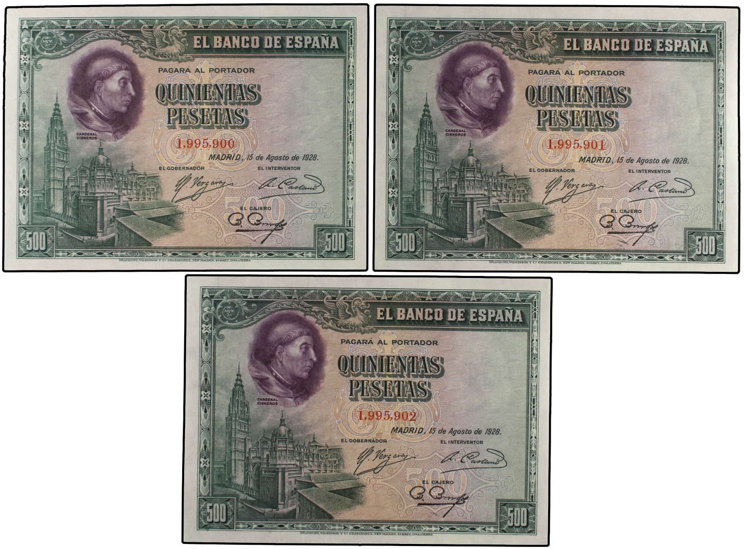 Lote 3 billetes 500 Pesetas. 15 Agosto 1928. Cardenal Cisneros. Trío correlativo. Ed-356. SC.