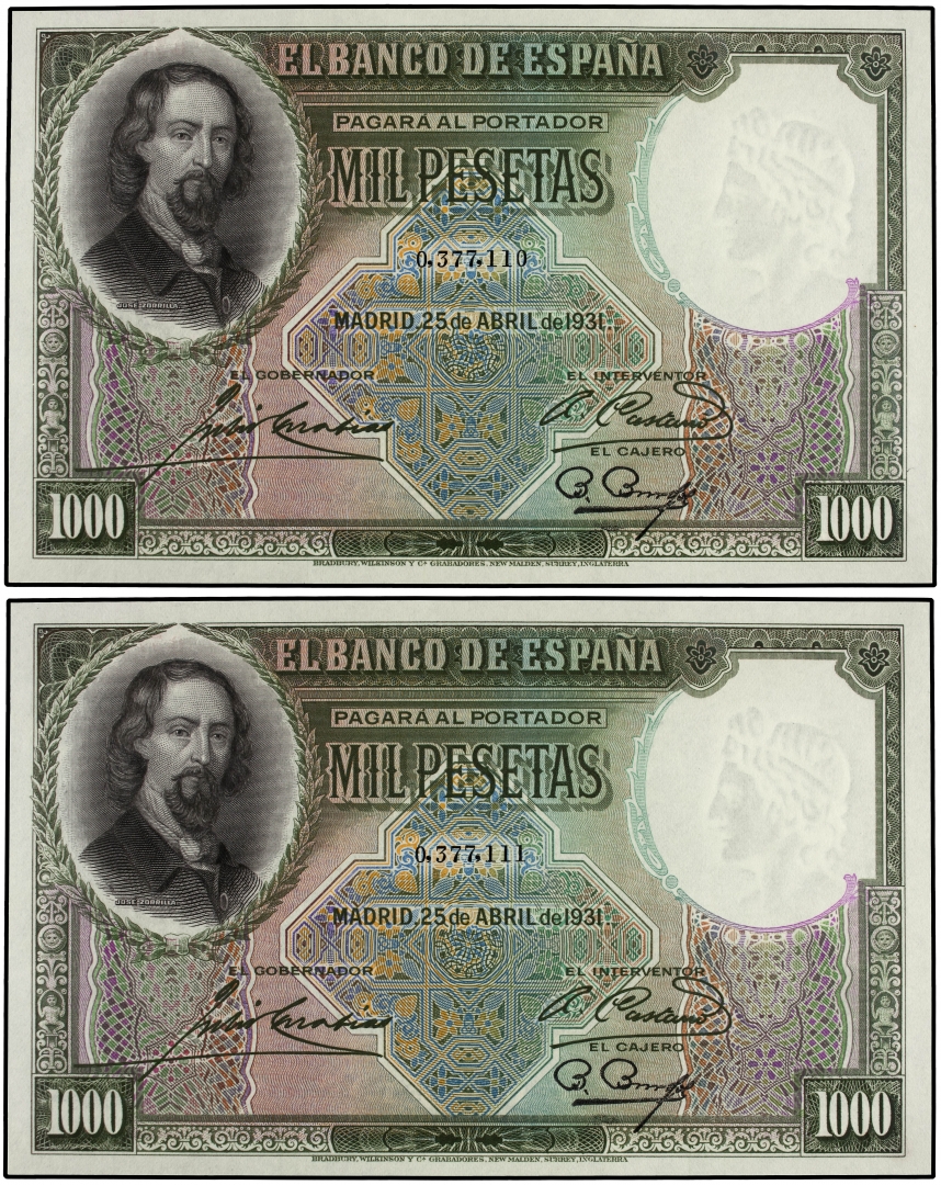 Lote 2 billetes 1.000 Pesetas. 25 Abril 1931. Zorrilla. Pareja correlativa. RARO ASÍ. Ed-362. SC.