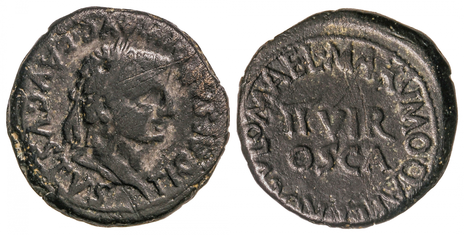 Semis. 14-36 d.C. ÉPOCA DE TIBERIO. OSCA (HUESCA). Anv.: TI. CAESAR DIVI. AVG. F. AVGVSTVS. Cabeza laureada de Tiberio a derecha. Rev.: II VIR OSCA M. AEL. MAXVMO. Q. AEL. PROCVLO. 5,95 grs. AE. Pátina oscura. ESCASA. AB-1939. MBC/MBC+.